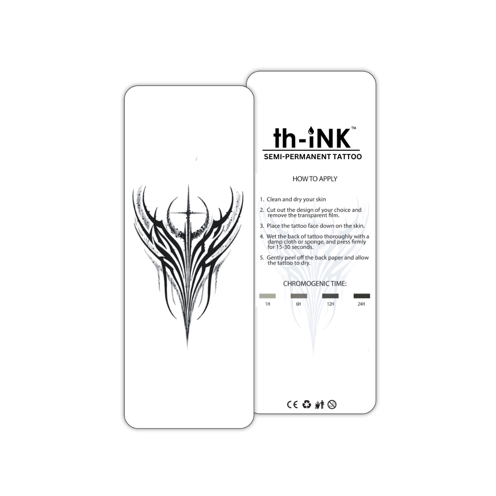 To apply the tattoo, remove the backing and place it sticky-side-down on the desired area. After positioning it, peel off the border and smooth out any wrinkles.