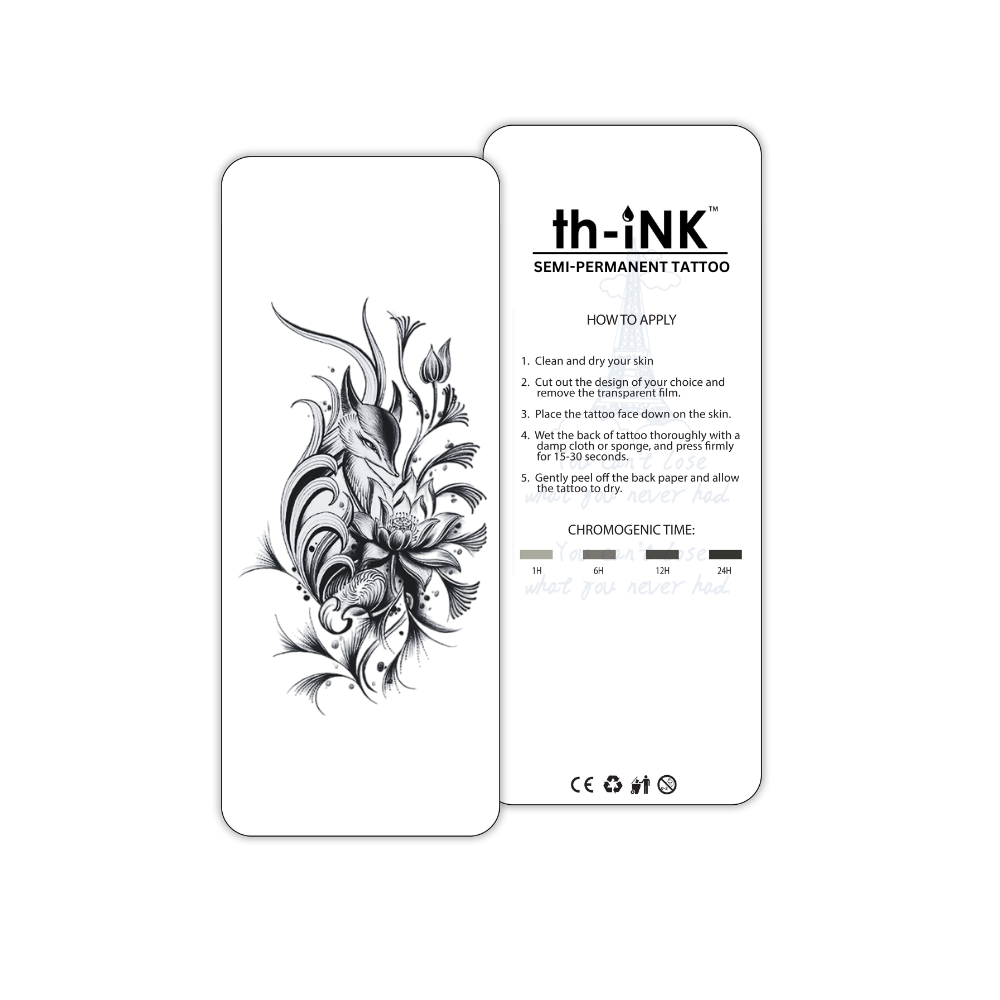 Step into the world of th-INK with our GZS Series 70mm x 120mm semi-permanent tattoo, designed to last up to two weeks. Whether you're looking to try something new or add a temporary flair to your style, our tattoos deliver a realistic and vibrant look, crafted from eco-friendly, plant-based ink. Vegan, cruelty-free, and hypoallergenic, this tattoo is perfect for all skin types and offers a seamless application process. Choose th-INK for an expressive, temporary tattoo experience that matches your personality and style.
